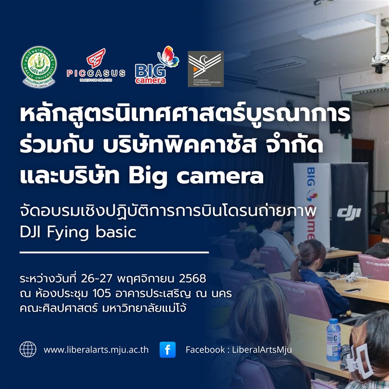 ในวันที่ 26-27 พฤศจิกายน 2568 สาขาวิชานิเทศศาสตร์บูรณาการ คณะศิลปศาสตร์ ม.แม่โจ้ ร่วมกับบริษัทพิคคาชัส จำกัด และบริษัท Big camera จำกัด จัดกิจกรรมฝึกอบรมด้านการบินโดรนพร้อมสอบใบอนุญาตบิน เพื่อเสริมสร้างทักษะด้านเทคโนโลยีการบินไร้คนขับให้กับนักศึกษาและบุคลากรที่สนใจ โดยภายในกิจกรรมมีทั้ง การให้ความรู้เกี่ยวกับกฎหมายและข้อปฏิบัติของผู้ใช้งานโดรน, การอบรมทฤษฎี, รวมถึง การฝึกภาคปฏิบัติแบบ Workshop กับวิทยากรผู้เชี่ยวชาญด้านการบินโดรนคุณกฤดา เสพมงคลเลิศ ณ ห้องประชุม 105 อาคารประเสริฐ ณ นคร คณะศิลปศาสตร์ และ สนามกีฬาอินทนิล ม.แม่โจ้