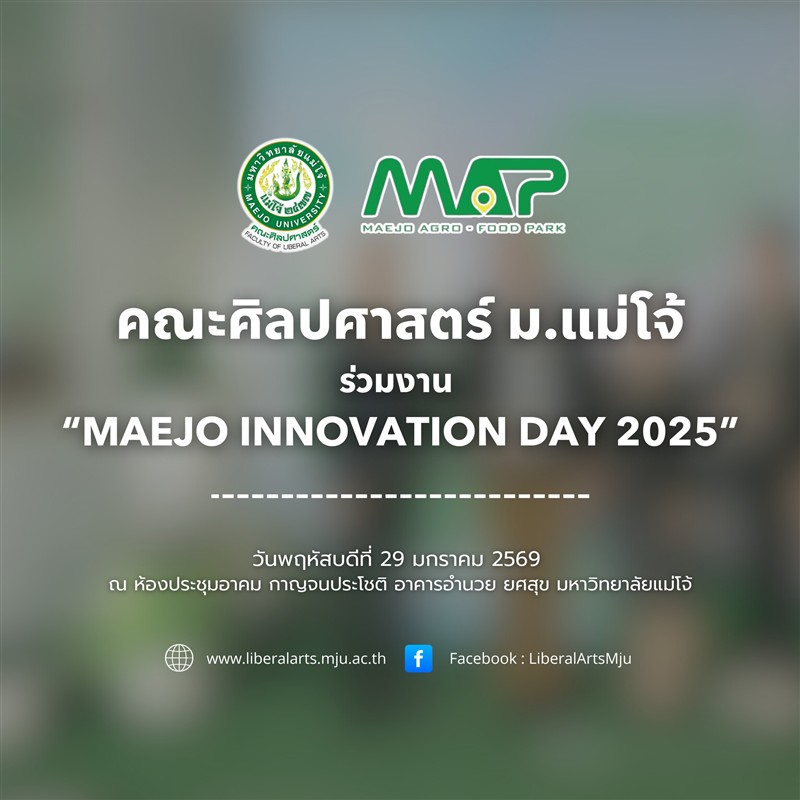 ในวันพฤหัสบดีที่ 29 มกราคม 2569 อาจารย์ ดร.ศรัณย์ จันทร์ทะเล คณบดีคณะศิลปศาสตร์ พร้อมผู้บริหารคณะฯ เข้าร่วมงาน Maejo Innovation Day 2025 : Transforming Knowledge into Sustainable Innovation จัดโดยอุทยานวิทยาศาสตร์เทคโนโลยีเกษตรและอาหาร ณ ห้องประชุมอาคม กาญจนประโชติ อาคารอำนวย ยศสุข ม.แม่โจ้ เพื่อส่งเสริมการนำผลงานวิจัยและนวัตกรรมไปใช้ประโยชน์เชิงเศรษฐกิจและสังคมอย่างยั่งยืน