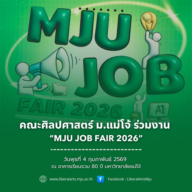 ในวันพุธที่ 4 กุมภาพันธ์ พ.ศ. 2569 ผู้บริหารคณะศิลปศาสตร์ มหาวิทยาลัยแม่โจ้ เข้าร่วมโครงการ MJU JOB FAIR 2026 ณ อาคารเรียนรวม 80 ปี มหาวิทยาลัยแม่โจ้ โดยมีผู้บริหาร คณาจารย์ บุคลากร นักศึกษา และสถานประกอบการจากภาครัฐและเอกชนเข้าร่วมงานเป็นจำนวนมาก