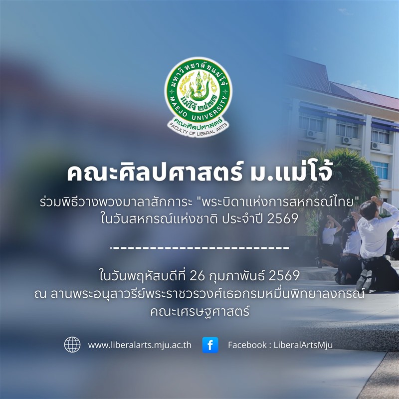 ในวันพฤหัสบดีที่ 26 กุมภาพันธ์ 2569 อาจารย์อาภาลัย สุขสำราญ รองคณบดีคณะศิลปศาสตร์ พร้อมบุคลากรคณะฯ เข้าร่วมพิธีวางพวงมาลาดอกไม้สดสักการะพระบิดาแห่งการสหกรณ์ไทย เนื่องในวันพระบิดาแห่งการสหกรณ์ไทย ณ ลานพระอนุสาวรีย์พระราชวรวงศ์เธอกรมหมื่นพิทยาลงกรณ์ คณะเศรษฐศาสตร์ มหาวิทยาลัยแม่โจ้ซึ่งงานดังกล่าวนั้น คณะเศรษฐศาสตร์มหาวิทยาลัยแม่โจ้ ร่วมกับ สหกรณ์จังหวัดเชียงใหม่ สันนิบาตสหกรณ์, ขบวนการสหกรณ์ในจังหวัดเชียงใหม่ และผู้แทนหน่วยงานภาครัฐ ภาคเอกชน ร่วมกันจัดงานวันสหกรณ์แห่งชาติ วางพวงมาลาสักการะ เพื่อน้อมรำลึกถึงพระกรุณาธิคุณของพระราชวรวงศ์เธอกรมหมื่นพิทยาลงกรณ์ "พระบิดาแห่งการสหกรณ์ไทย"