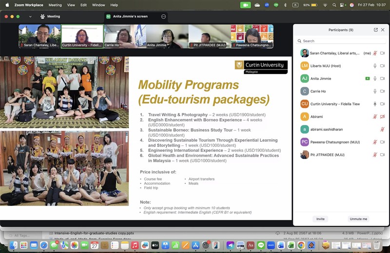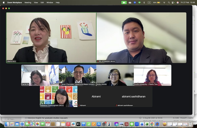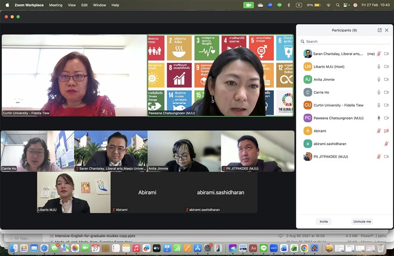 วันศุกร์ที่ 27 กุมภาพันธ์ 2569 นำโดย ดร.ศรัณย์ จันทร์ทะเล คณบดีคณะศิลปศาสตร์ และ ผศ.ดร.ปวีนา ฉัตรสูงเนิน โดยมี ดร.มารียาดาร์ ธีดาอักษรสกุลส์ เป็นผู้ประสานงานหลักในการเชื่อมโยงความร่วมมือระหว่างสองสถาบัน การประชุมออนไลน์ครั้งนี้จัดขึ้นเพื่อหารือความร่วมมือระดับนานาชาติกับ ดร. แอนนิต้า จิมมี่ รองคณบดีฝ่ายพันธกิจสัมพันธ์ภายนอก ผู้เชี่ยวชาญอาวุโสด้านการสอน และคณะผู้บริหารจาก ภาควิชาการเรียนรู้ควบคู่การทำงานและภาษา คณะเตรียมเข้ามหาวิทยาลัยและการศึกษาต่อเนื่อง (Department of WIL & Language