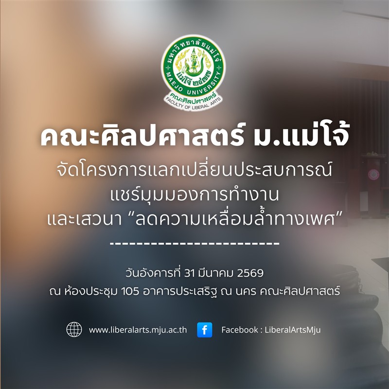 ในวันอังคารที่ 31 มีนาคม 2569 คณะศิลปศาสตร์ มหาวิทยาลัยแม่โจ้ จัดโครงการแลกเปลี่ยนประสบการณ์ พร้อมเวทีเสวนาในหัวข้อ “ลดความเหลื่อมล้ำทางเพศ” เพื่อเปิดพื้นที่ในการแลกเปลี่ยนเรียนรู้ สะท้อนมุมมอง และสร้างความเข้าใจเกี่ยวกับประเด็นความเท่าเทียมทางเพศในบริบทของสังคมและการทำงาน ณ ห้องประชุม 105 อาคารประเสริฐ ณ นคร คณะศิลปศาสตร์ มหาวิทยาลัยแม่โจ้