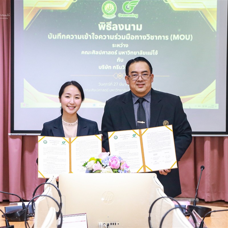 โดยมี อาจารย์ ดร.ศรัณย์ จันทร์ทะเล คณบดีคณะศิลปศาสตร์ มหาวิทยาลัยแม่โจ้ เป็นผู้แทนลงนามในนามคณะศิลปศาสตร์ และคุณปิยากร จิตรสกุล กรรมการบริหาร เป็นผู้แทนลงนามในนามบริษัท กรีนวิง จำกัด