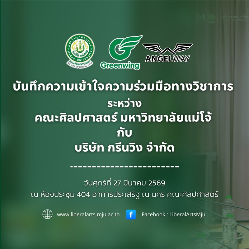 ในวันศุกร์ที่ 27 มีนาคม 2569 คณะศิลปศาสตร์ มหาวิทยาลัยแม่โจ้ จัดพิธีลงนามบันทึกความเข้าใจความร่วมมือทางวิชาการ ร่วมกับ บริษัท กรีนวิง จำกัด ณ ห้องประชุม 404 อาคารประเสริฐ ณ นคร คณะศิลปศาสตร์