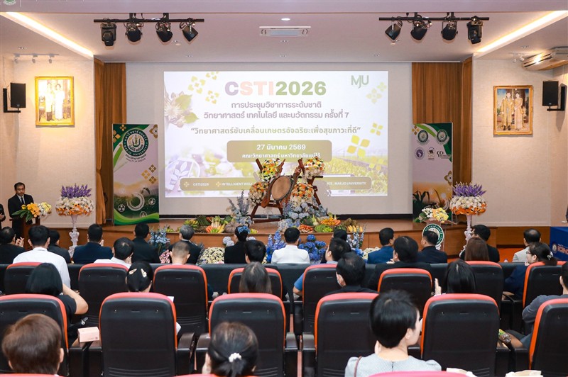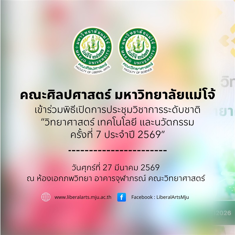 วันศุกร์ที่ 27 มีนาคม 2569 อาจารย์ ดร.ศรัณย์ จันทร์ทะเล คณบดีคณะศิลปศาสตร์ มหาวิทยาลัยแม่โจ้ พร้อมผู้บริหารคณะฯ เข้าร่วมเป็นเกียรติในพิธีเปิดงานการประชุมวิชาการระดับชาติ “วิทยาศาสตร์ เทคโนโลยี และนวัตกรรม ครั้งที่ 7 ประจำปี 2569” จัดโดยคณะวิทยาศาสตร์ มหาวิทยาลัยแม่โจ้ ณ ห้องเอกภพวิทยา อาคารจุฬาภรณ์ คณะวิทยาศาสตร์ เพื่อเป็นเวทีในการนำเสนอผลงานทางวิชาการและงานวิจัยของนักศึกษา คณาจารย์ และนักวิจัยจากหลากหลายสถาบัน