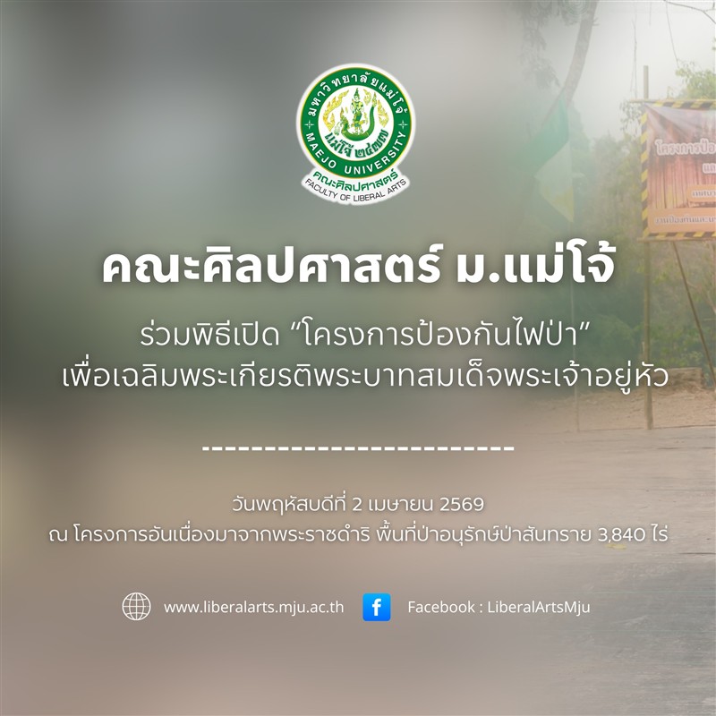 วันพฤหัสบดีที่ 2 เมษายน 2569 อาจารย์ ดร.ศรัณย์ จันทร์ทะเล คณบดีคณะศิลปศาสตร์ พร้อมด้วยผู้บริหาร และบุคลากรคณะศิลปศาสตร์ ได้เข้าร่วมโครงการป้องกันไฟป่า เพื่อเฉลิมพระเกียรติพระบาทสมเด็จพระเจ้าอยู่หัว เนื่องในโอกาสพระราชพิธีมหามงคลเฉลิมพระชนมพรรษา 28 กรกฎาคม 2569 โดยกิจกรรมจัดขึ้น ณ โครงการอันเนื่องมาจากพระราชดำริ พื้นที่ป่าอนุรักษ์ป่าสันทราย 3,840 ไร่